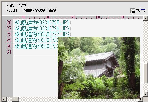 - エディタ部分にはクリッカブルURLに加え、外部ファイルへのリンクを挿入できます。挿入は OLE ドラッグ&ドロップで行えるため、例えば Internet Explorer などから画像をドラッグしてローカルに保存することが可能です。